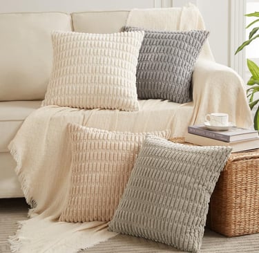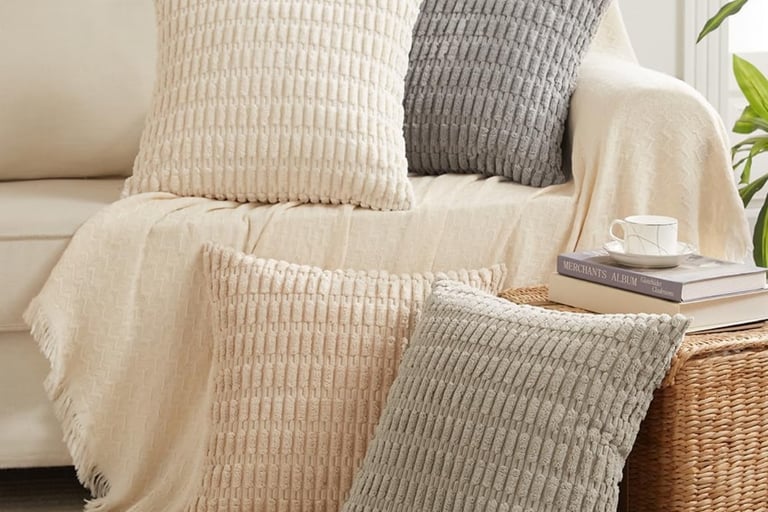 These knit textured pillow covers instantly make any sofa look softer and more styled. They add that subtle texture that makes a room feel professionally decorated without being loud or overwhelming. I love the warm neutrals — beige, cream, and gray — because they layer beautifully with any blanket, sofa color, or seasonal decor.