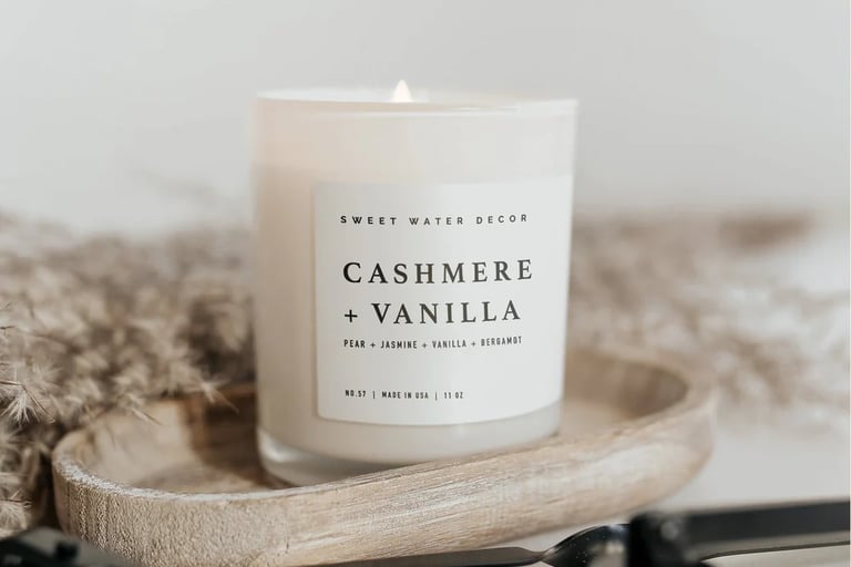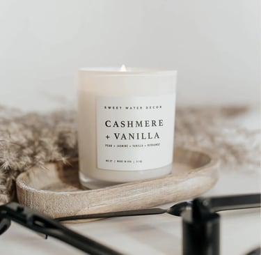 This cozy soy candle is the perfect finishing touch for a warm, neutral living room. The Cashmere & Vanilla scent blends pear, jasmine, vanilla, and bergamot — giving your home that soft, luxurious, hotel-meets-spa vibe. The minimal label and glass jar also match perfectly with neutral décor styles.