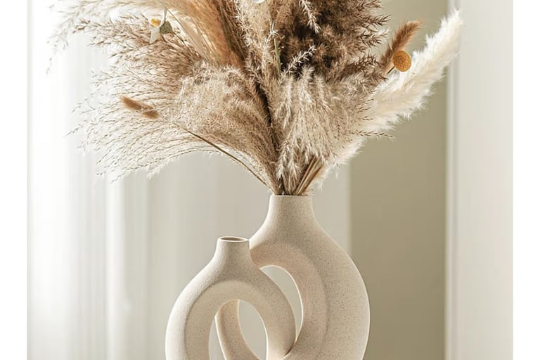 This sculptural ceramic vase is one of the easiest ways to elevate your living room without spending a lot. The curved, modern design looks like something you’d find at a high-end designer store, but it’s affordable and extremely aesthetic. When paired with pampas grass or dried florals, it instantly softens the room and adds that neutral, cozy, warm vibe.